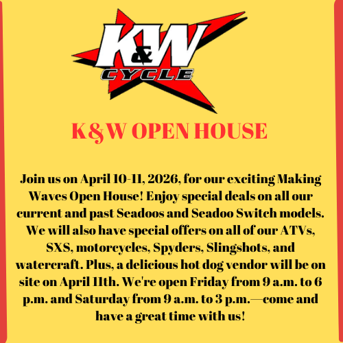Look to us for all your riding fun. Our selection of ATVs and recreational vehicles are designed to accommodate everyone from the farmer, rancher, or outdoorsman to the weekend warrior and avid sports rider. Our friendly, knowledgeable staff; quick, dependable service department; and affordable prices all come together to make your shopping experience one you'll remember. You'll be sure to find what you're looking for, with names like E-Z-Go, Kawasaki, Ski-Doo, Can-Am, Yamaha, Polaris®, Slingshot®, and Sea-Doo all in stock. We carry a wide selection of snowmobiles, UTVs, side x sides, ATVs, street bikes, dirt bikes, cruisers, sport bikes, PWCs, Jet Skis, and Golf Carts. Let K&W Cycle be part of your choice for work or fun.